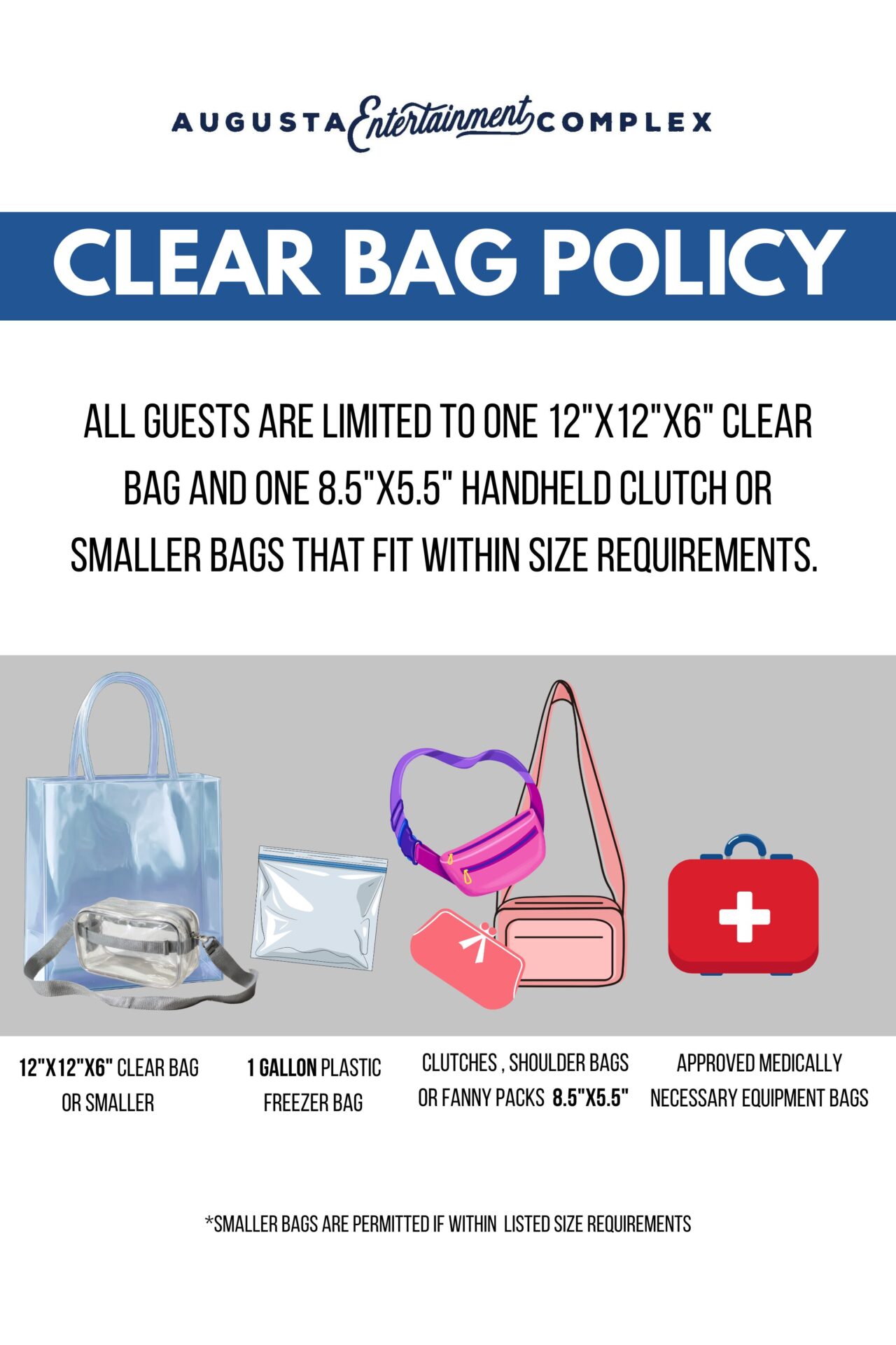 Guests are limited to one 12″ x 12″ x6″ CLEAR bag or one 8.5″ x 5.5″ handheld clutch.